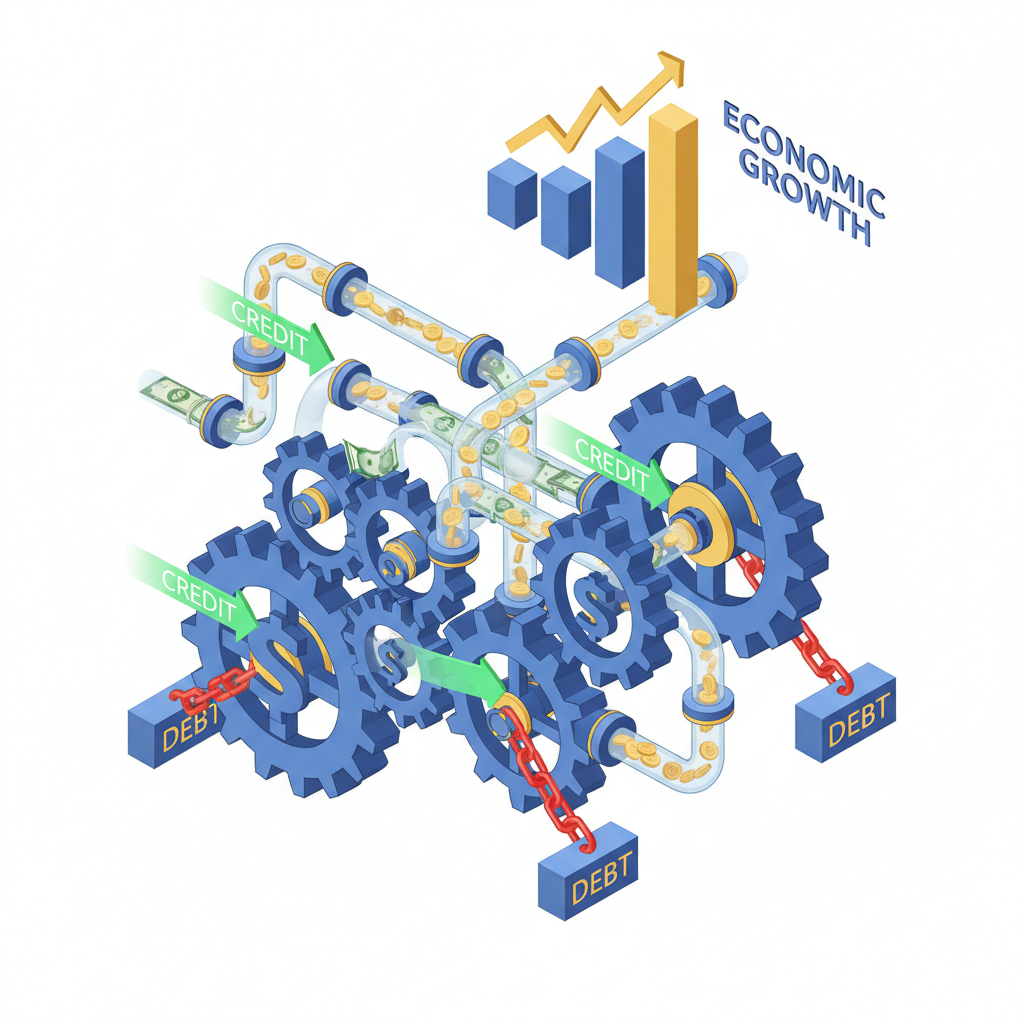 Кредит выполняет роль «смазки» для экономического механизма. Он позволяет субъектам экономики (людям, компаниям, правительствам) тратить больше, чем они зарабатывают в текущий момент, ускоряя тем самым экономический рост.